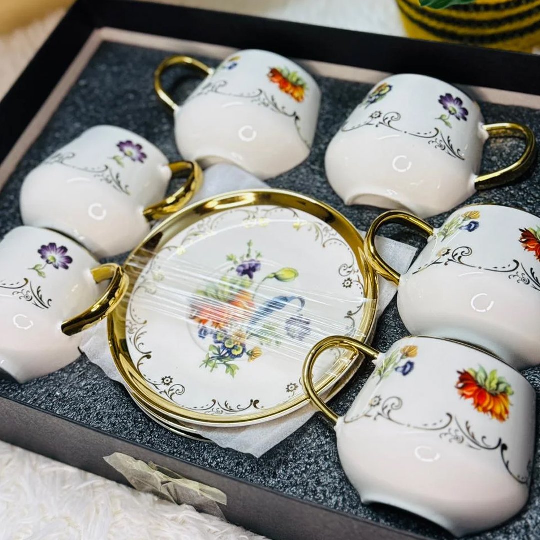 উন্নত মানের ও টেকসই ম্যাটেরিয়াল দিয়ে তৈরি প্রতিটি কাপে রয়েছে সুন্দর ফ্লোরাল প্রিন্ট এবং মজবুত গোল্ডেন হ্যান্ডেল, যা আরামদায়ক গ্রিপ নিশ্চিত করার পাশাপাশি সেটটিকে দিয়েছে প্রিমিয়াম লুক। সাথে থাকা ম্যাচিং সার্ভিং প্লেট অতিথি পরিবেশনকে করে আরও গোছানো ও আকর্ষণীয়—যা প্রতিদিনের ব্যবহার ও বিশেষ অনুষ্ঠানের জন্য সমানভাবে উপযোগী।